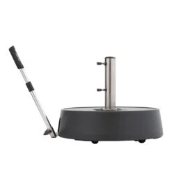 Eine optisch schöne Aluminium-Hülle verbirgt ein Sockelgewicht von 50kg. Der Schirmständer ist optisch modern und zeitlos. Große Skaterrollen sowie ein ausziehbarer Griff machen ein müheloses Bewegen einfach.
