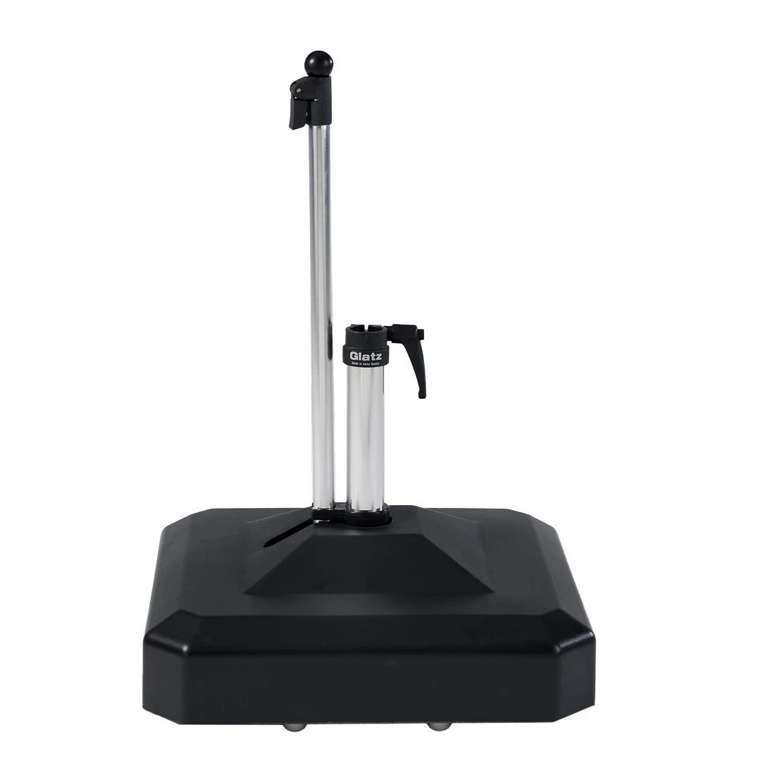 Dieser Rollensockel lässt sich anhand eines ausziehbaren Bedienhebels nach oben heben (die Rollen haben dadurch einen Freilauf) und bequem an einen anderen Standort fahren. Im abgesenkten Zustand bietet dieser Schirmständer eine hohe Standfestigkeit.