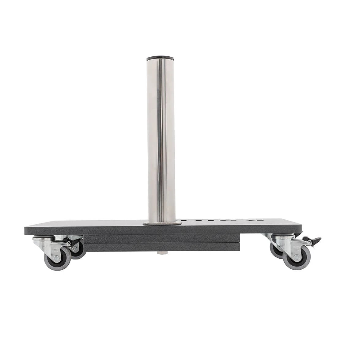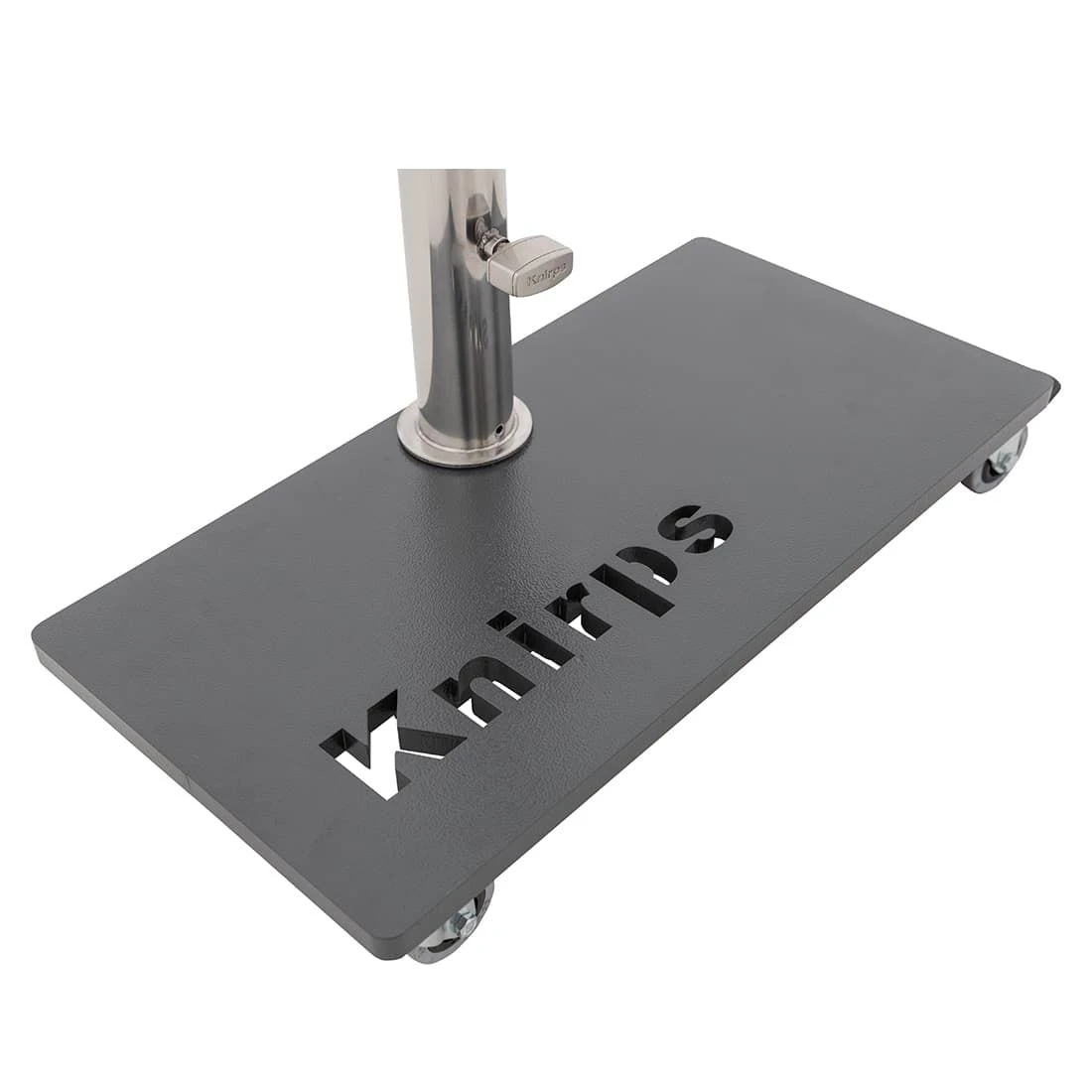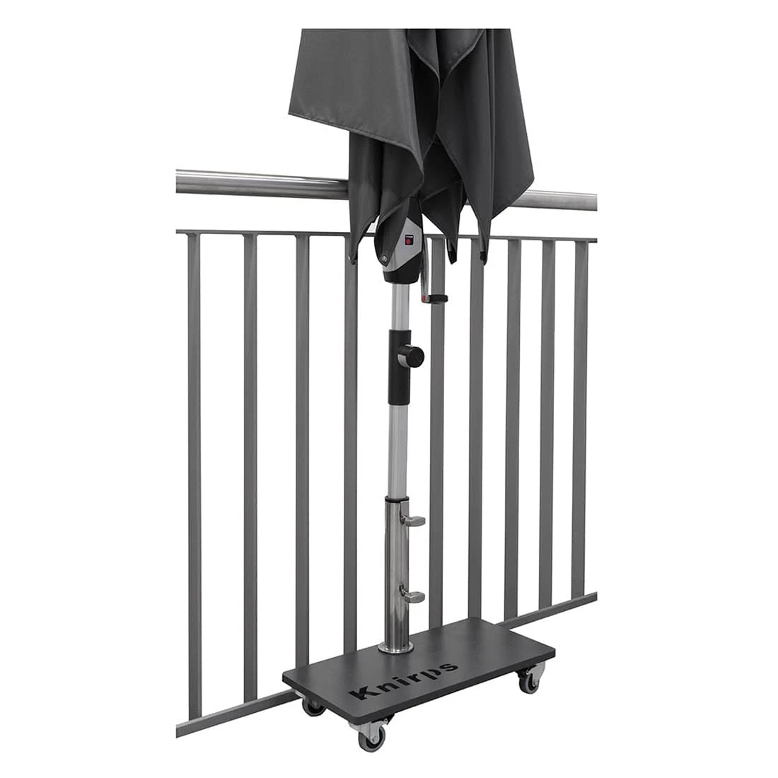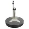 Der Schirmständer in der Größe 50x25x8cm ist mit 4 Rollen (inkl.Feststeller) ausgestattet. Das Edelstahl-Standrohr wird mit der pulverbeschichteten Stahlplatte verschraubt. Aufnahmemöglichkeiten mit Reduzierstücken 25, 32 oder 38mm. Das Standrohr hat einen Innendurchmesser von 48mm. Ein edles Design für moderne Terassen, geeignet für viele Mittelstockschirme.
