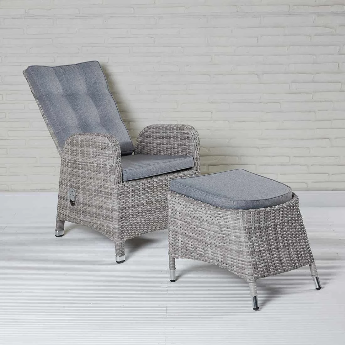 Der Korpus und die Sitzfläche bestehen aus Polyrattan-Geflecht. Das Gestell wird aus Aluminium gefertigt. Das geringe Eigengewicht des Materials macht den Gartensessel zu einem robusten, aber dennoch leicht zu transportierenden Sitzmöbel auf Ihrer Terrasse. Als hochwertiges Material für den Bezug kommt ein Polyester-Stoff zum Einsatz. Er ist sehr strapazierfähig und bietet somit die idealen Voraussetzungen für den Einsatz im Freien. Damit der Gartensessel optisch ansprechend ist, sind der Korpus und die Sitzfläche im Farbton White Grey gehalten. Gestell und Bezug begeistern hingegen in Grau.