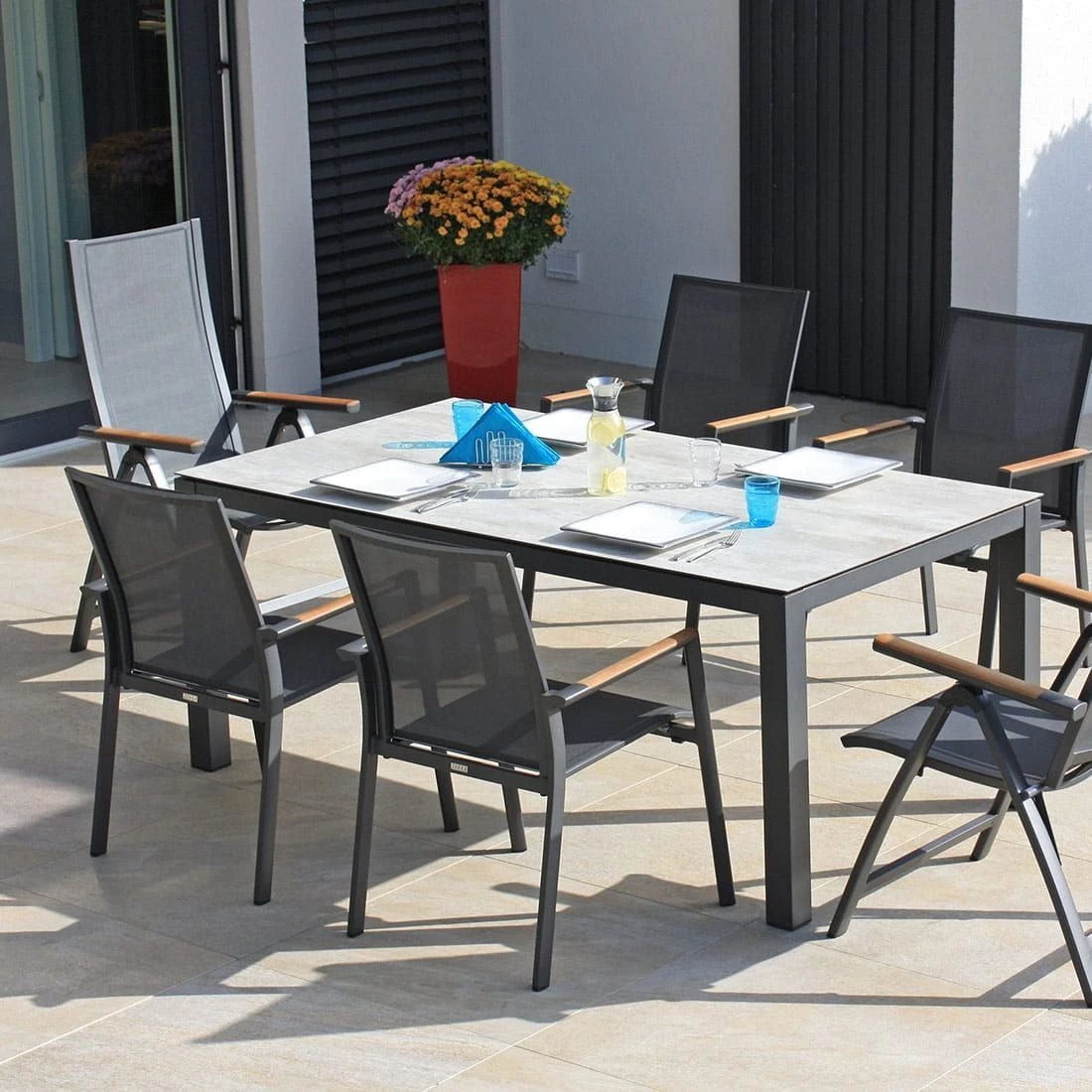 Ein weiteres Highlight des Klappsessels ist die Bespannung mit Textilene in der Farbe Carbon Grey. Dieser Bezugsstoff überzeugt durch eine hohe Robustheit gegenüber Hitze und Frost aus und ist leicht zu reinigen. Nur wenig Platz, um den Klappsessel im Winter einzulagern? Kein Problem, denn dieses Möbelstück ist klappbar und somit kompakt zu verstauen. Der Klappsessel ist mittels Rasterschienen individuell verstellbar. Diese Funktion ermöglicht Ihnen daher immer die ideale Position – ganz gleich, ob Sie essen, lesen oder einfach entspannen möchten. Mit einer Belastbarkeit von 100 kg ist dieses Sitzmöbel äußerst robust. Die Sitzfläche hat mit 45 cm eine komfortable Höhe.